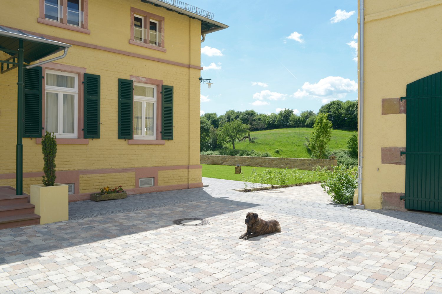 Blick vom Innenhof auf die Hausweide